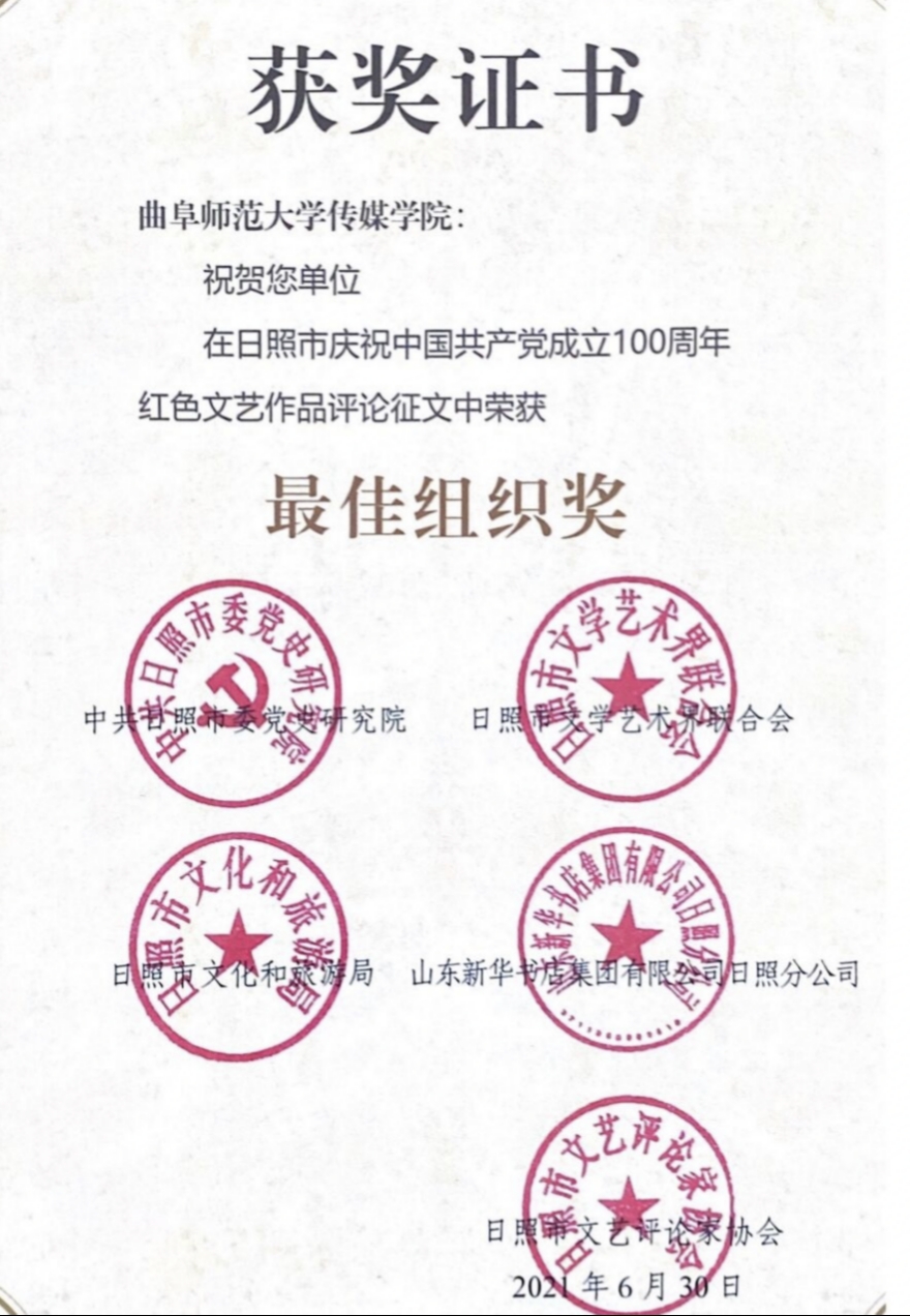在比赛中荣获“最佳组织奖”,学生共获“二等奖”、“三等奖”、“优秀奖”、“佳作奖”等63项奖项。其中,20级新闻学刘墨玲获“二等奖”,周羽柔等4名学生获“三等奖”,曾琴令等19名学生获“优秀奖”,向兰等38名学生获“佳作奖”。随后,日照市文艺评论家协会会员、老虎机