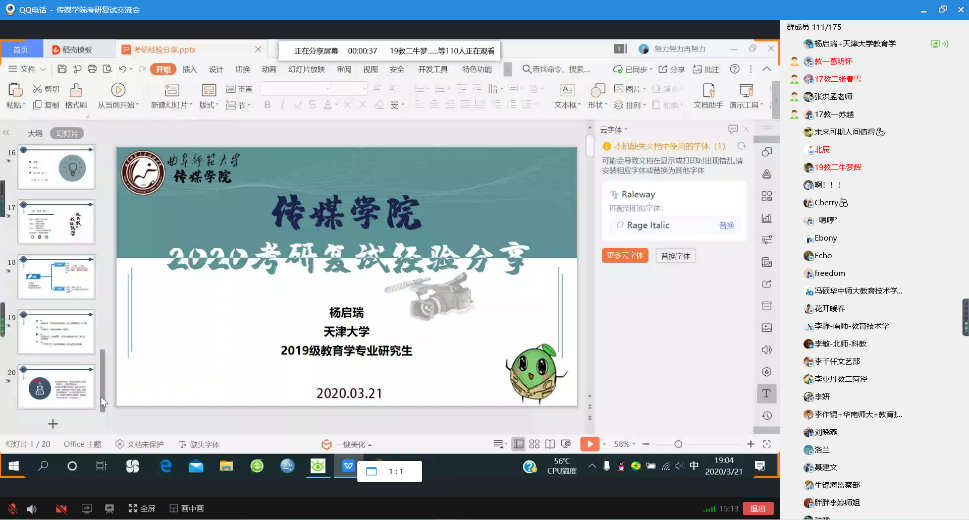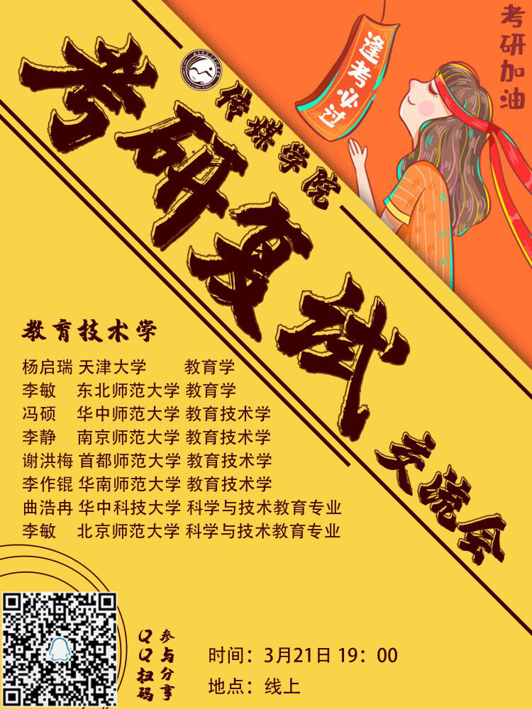 举办2020年教育技术学专业考研复试经验线上分享会。本次分享会邀请到了天津大学2019级教育学专业研究生杨启瑞、东北师范大学2019级教育学专业研究生李敏、华中师范大学2019级教育技术学专业研究生冯硕、南京师范大学2019级教育技术学专业研究生李静、首都师范大学2019级教育技术学专业研究生谢洪梅、华南师范大学2019级教育技术学专业研究生李作锟、华中科技大学2019级科学与技术教育专业研究生曲浩冉、北京师范大学2019级科学与技术教育专业研究生李敏,共计6位老虎机