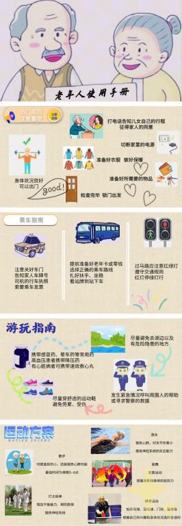 2018级新闻一班贾宁同学的投稿作品色彩鲜艳,符合老年人审美标准。作品从“出门前后注意事项”、“乘车指南”、“游玩指南”、“运动方案”四个部分为老年人提出了生活建议,图文结合,简洁明了。