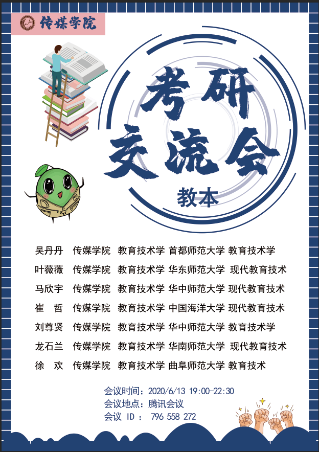 通过腾讯会议举行教育技术学专业考研经验交流会。交流会邀请到2016级教育技术学专业优秀毕业生吴丹丹、叶薇薇、马欣宇、崔哲、刘尊贤、龙石兰、徐欢为大家分享考研经验。教育技术学专业学生参加本次会议,会议由老虎机