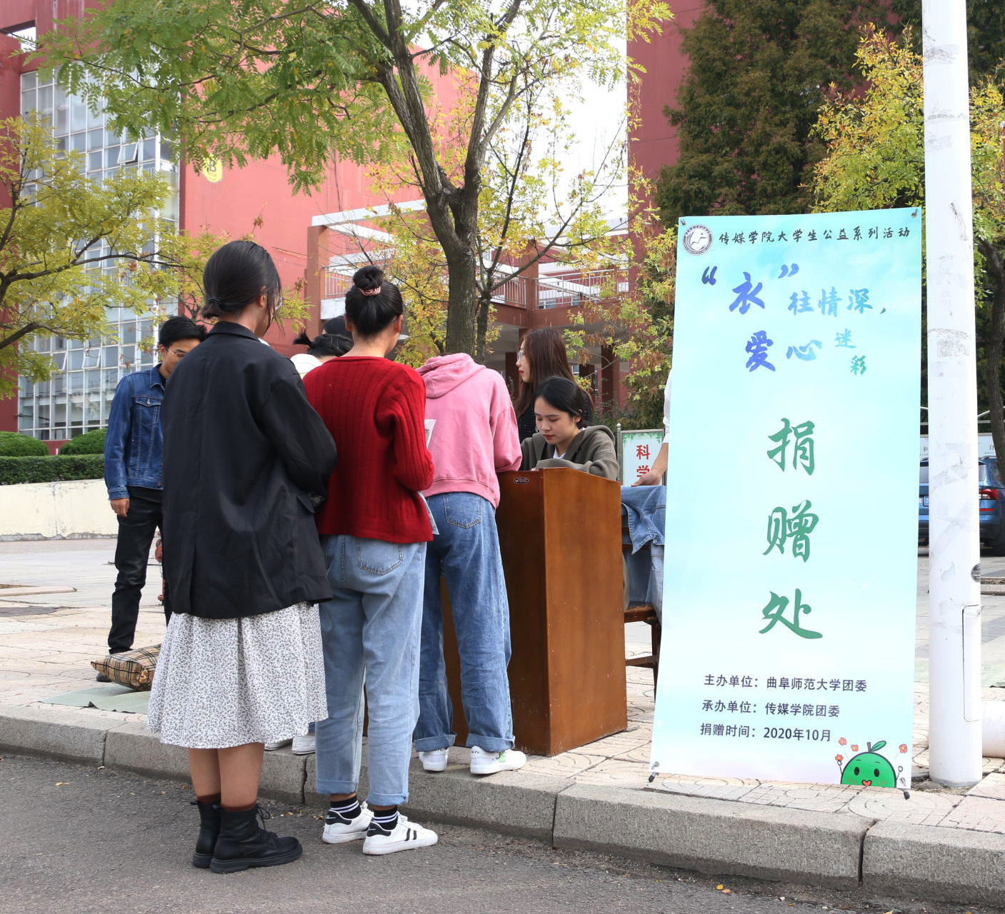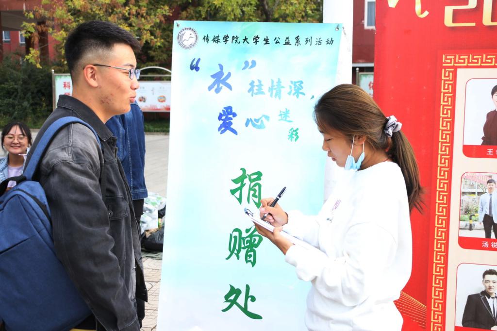 组织承办的以“'衣'往情深,爱心迷彩”为主题的公益捐赠活动顺利开展,该活动在学校日月广场和校区北门设置捐赠点,通过募捐闲置军训服并最终送予城市一线工人的形式,实现旧物的回收再利用,传播社会正能量。