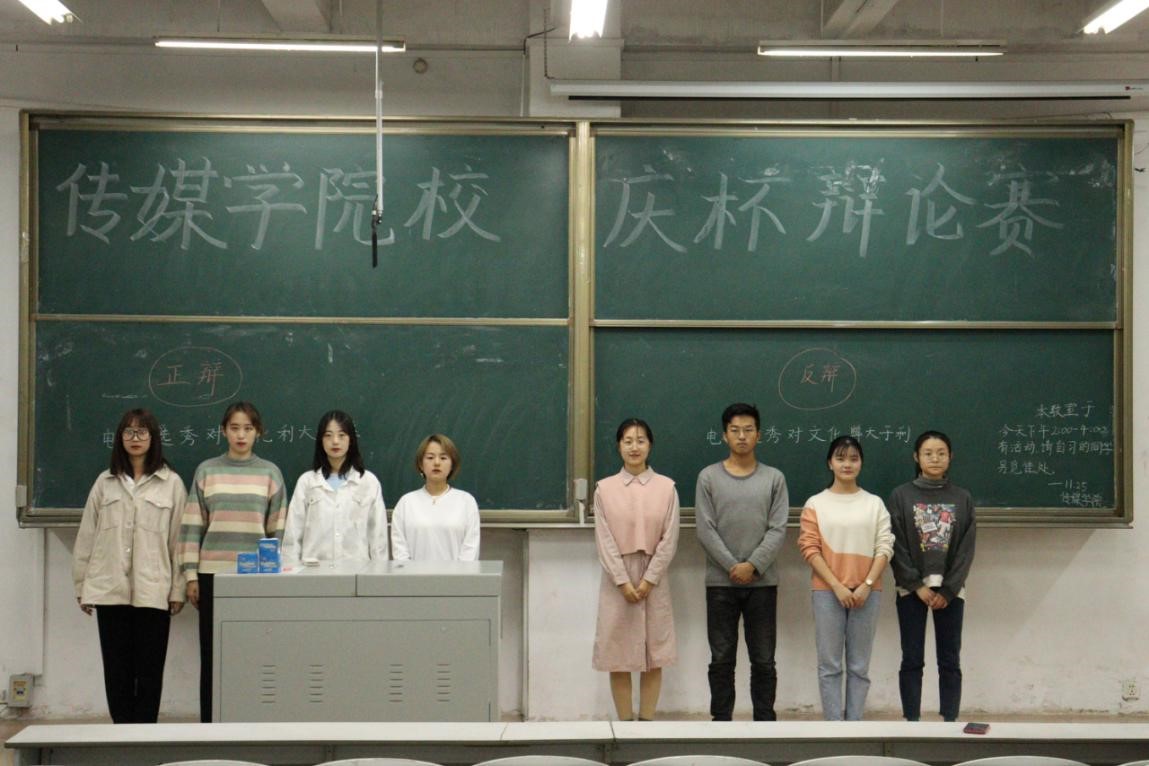 自行组织参赛人员进行“校庆杯”辩论赛初赛、复赛。本次初赛的辩论过程由立论与质询、质询小结、对辩、盘问、自由辩论、总结陈词六个部分组成。比赛过程中,双方就“电视选秀对文化的影响”这一辩题进行辩论,正方持有的观点是“电视选秀对文化利大于弊”。在自由辩论环节,正反双方交替发言,正方以“电视选秀推动文化朝着多元化方向发展”这一论据为切入点展开论述,与反方四位辩手进行激烈辩论。辩论双方思路清晰,不断提出质疑、回答对方问题、提出个人看法、反驳对方观点。