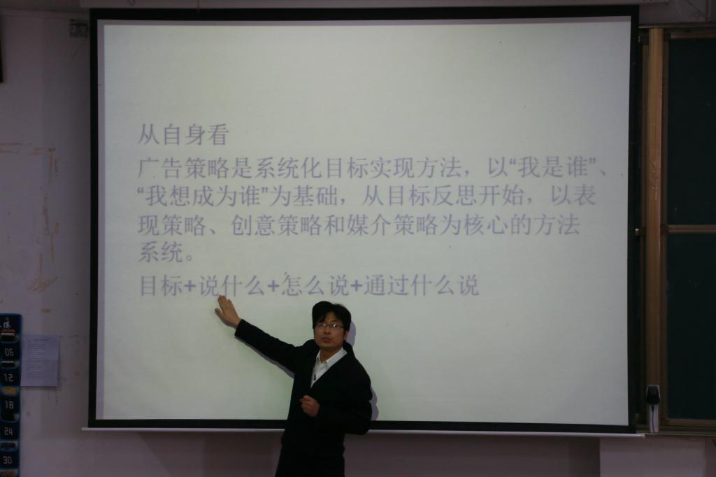 在课程正式开始前潘虎老师对上次课后作业——完成一篇自我介绍进行了点评,并指出了同学们的不足,继而引出本节课主题——如何进行广告策划,按照广告策略的概念、理念以及如何做的顺序开展课程的讲解。潘老师通过列举天猫、京东、一号店的例子来阐明广告定位的重要意义,并告诉同学们要从战略角度看策略。潘老师还以“如何向寺庙推销梳子”的问题为切入点与同学们展开互动,同学们积极作答,老师对同学们的回答逐条分析,指出销售不能抱残守缺,固化思维,要学习海尔公司积极发现小市场的策略。课堂的最后,老师要求同学们课下思考“如何提高牙膏销量”的问题并结束本节课的讲解。