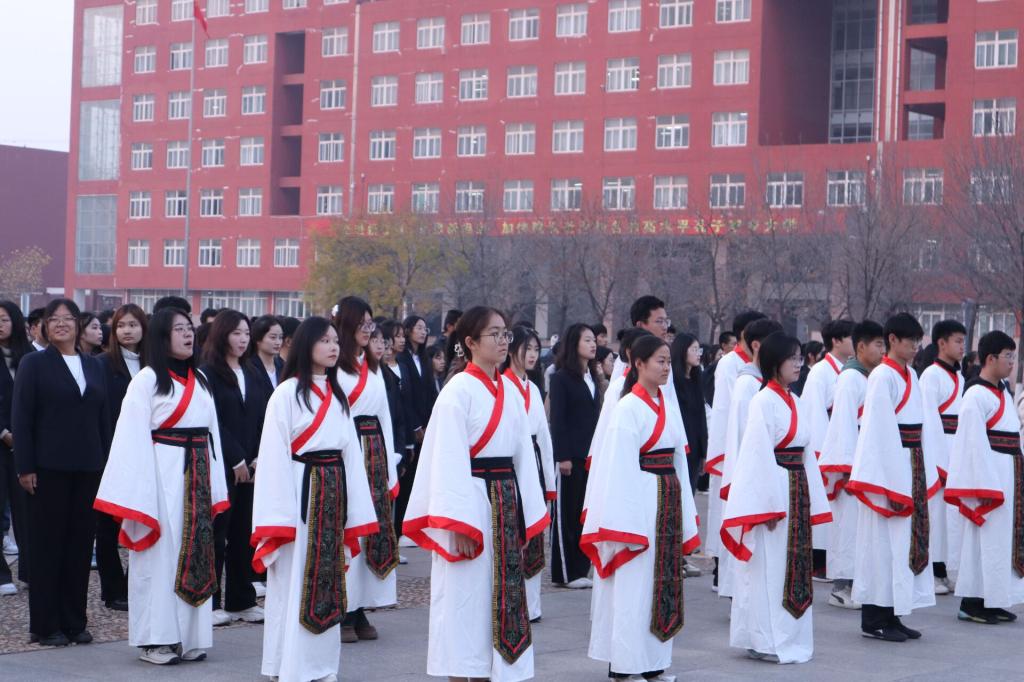 “自古便有男子二十弱冠,女子十五及笄之礼,成人礼不仅仅是一个仪式,亦是一个步入社会参与各种活动的标记。”活动在主持人的介绍中缓缓拉开帷幕。遵循传统成人礼的礼制,在悠扬的高山流水背景音乐中,全体师生面谒至先师孔子行三揖礼 ;师生们严格按照揖礼的动作要领,向先师孔子表达崇尚的敬意。一朝冠礼,立身行道,希望新生在大学生活中坚定自身信念、锻炼个人能力,找到自己内心真正想要从事的事业,为社会主义现代化建设贡献青春力量。