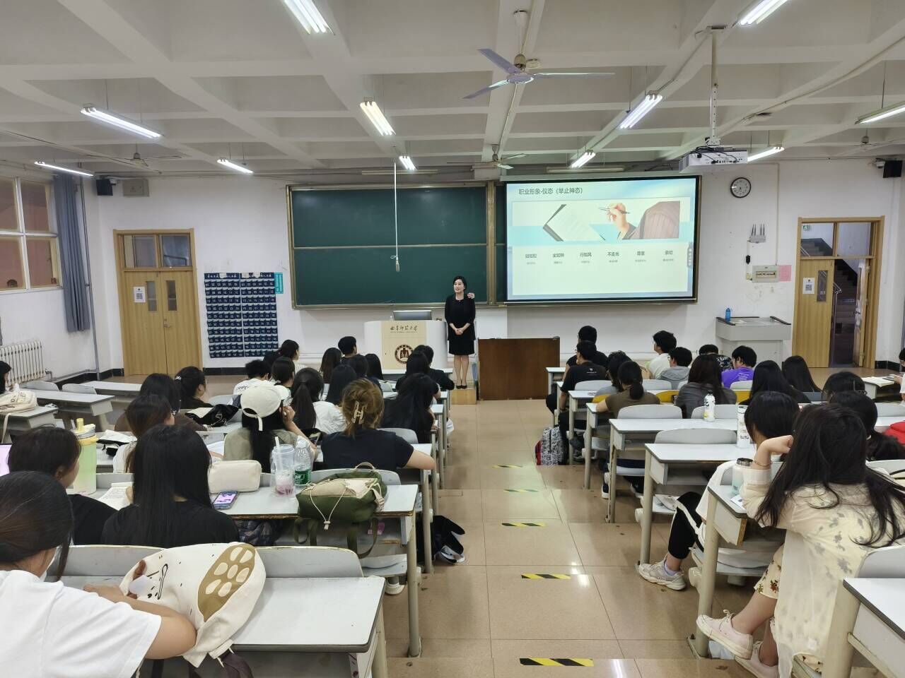 朱珊珊在男女士仪表、男女站姿、标准坐姿、标准行姿、鞠躬礼、目光范围、交谈距离、说话技巧等方面通过亲自演示、互动交流给出中肯建议。她认为,“细节决定成败”,尤其要控制小动作,做到仪态沉稳、言行得体。她还围绕面试流程中的不同环节与场景进行规范礼仪展示,并鼓励在场学生深入学习面试礼仪知识,仔细了解各单位面试的全流程环节,积极争取实习面试机会,在实践中锻炼个人表现能力,为自己的未来就业积累面试经验。