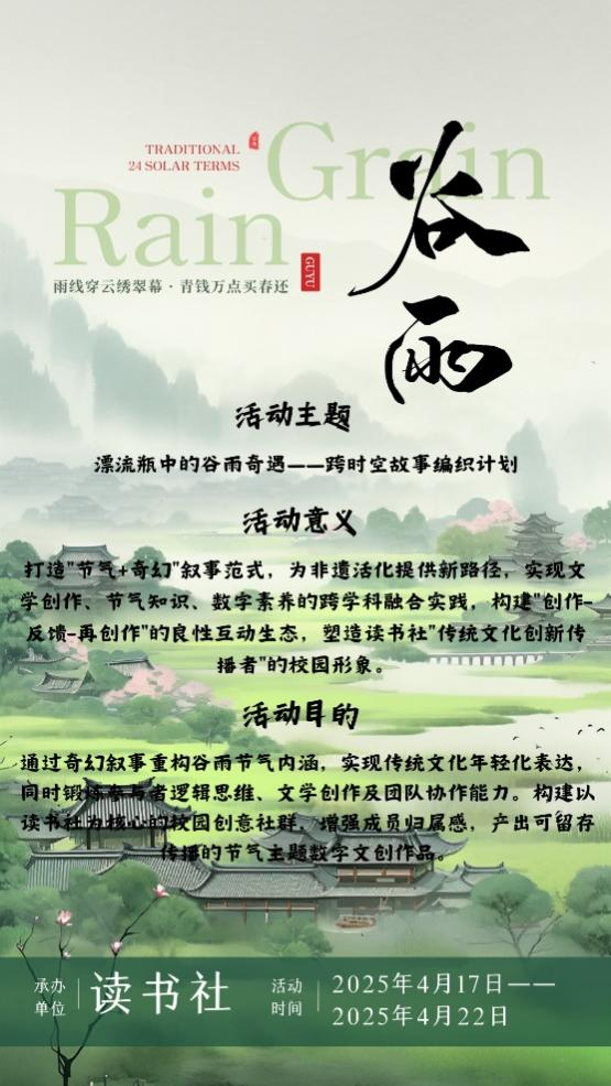为激发同学们对传统文化的感知和认识,以轻量化、互动式创作形式提升学生的文学参与度。4月17日至4月22日,读书社开展漂流瓶中的谷雨奇遇——跨时空故事织制计划系列活动。