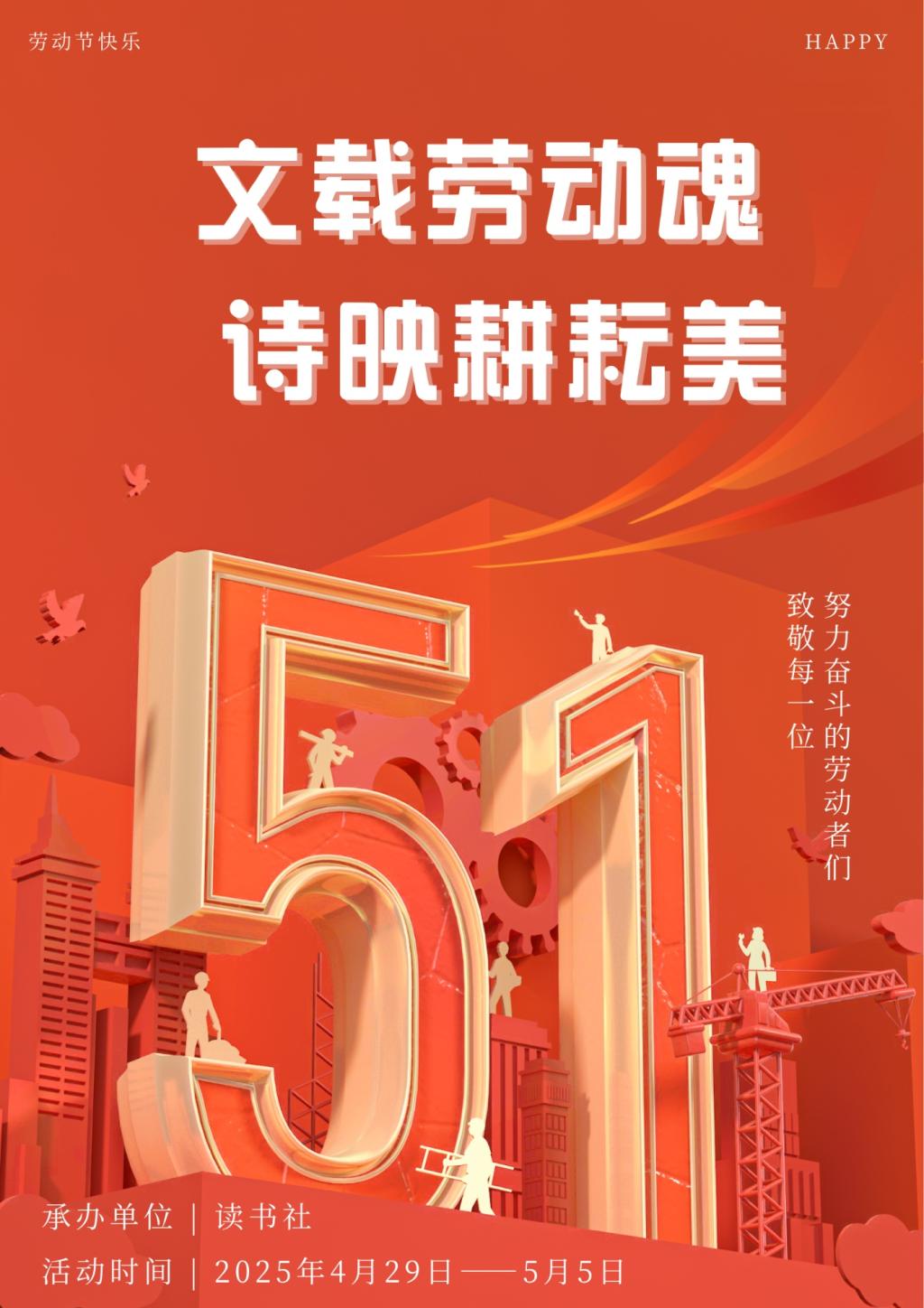 五一劳动节期间,为弘扬劳动精神,激活传统文化中“耕读传家”“民生在勤”的精神内核,读书社于4月29日 - 5月5日开展“文载劳动魂 诗映耕耘美”主题活动。