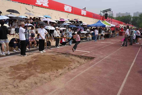 跳远项目中,选手们助跑加速,在起跳点奋力起跳,身体腾空后落入沙坑。整个过程一气呵成,他们用行动展现自己的实力。