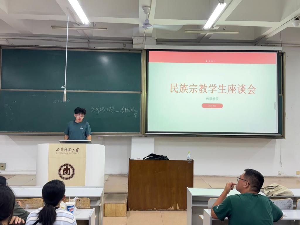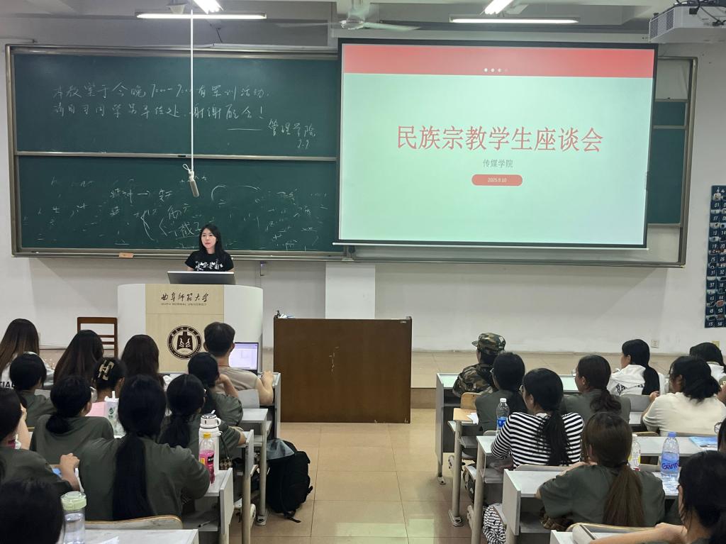 于A楼召开“学习民族宗教事务”主题班会。2025级全体本科新生参与座谈会,2023级带班学生干部主持会议,2025级辅导员张洪孟出席会议。