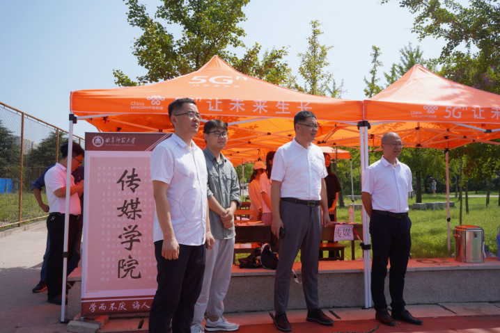 领导老师们首先询问了学院连队的分布位置,简单了解了学生训练进展情况。王宏杰对学生们不怕苦不怕累、坚持在烈日下军训的积极态度进行表扬,鼓励学生认真完成军训任务,锻炼体质,磨练意志,充分展现传媒学子吃苦耐劳、焕然一新的精神面貌,并对新同学们今后的学习生活表示期待。随后,来到学院帐篷处,领导老师对见习新生表示关心,并提醒同学们应在保证身体健康情况下,充分利用见习时间,提高自身军事理论素养,充实军训生活。对于军训值班志愿者,领导老师表示,军训工作的顺利进行离不开志愿者的支持与付出,提醒他们在做好军训的后勤保障工作的同时,注意个人休息,做到劳逸结合。