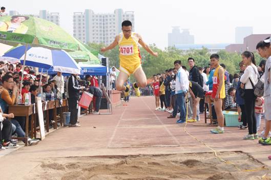 在男子三级跳远中,腾空而起的就是罗华鑫,在起跳时爆发的张力与激情,使他毫无悬念的技压群雄,夺得冠军。