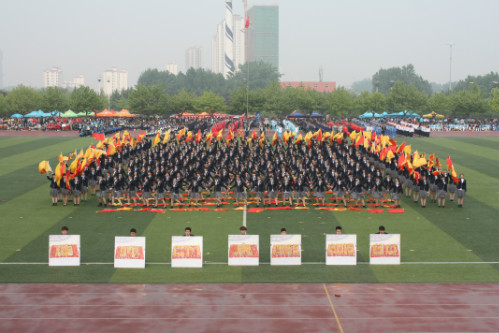 四十多名传媒学子,身穿白色文化衫,用扇子摆出“NO 1”的字样。象征着传媒学子一往无前、勇夺第一的目标。