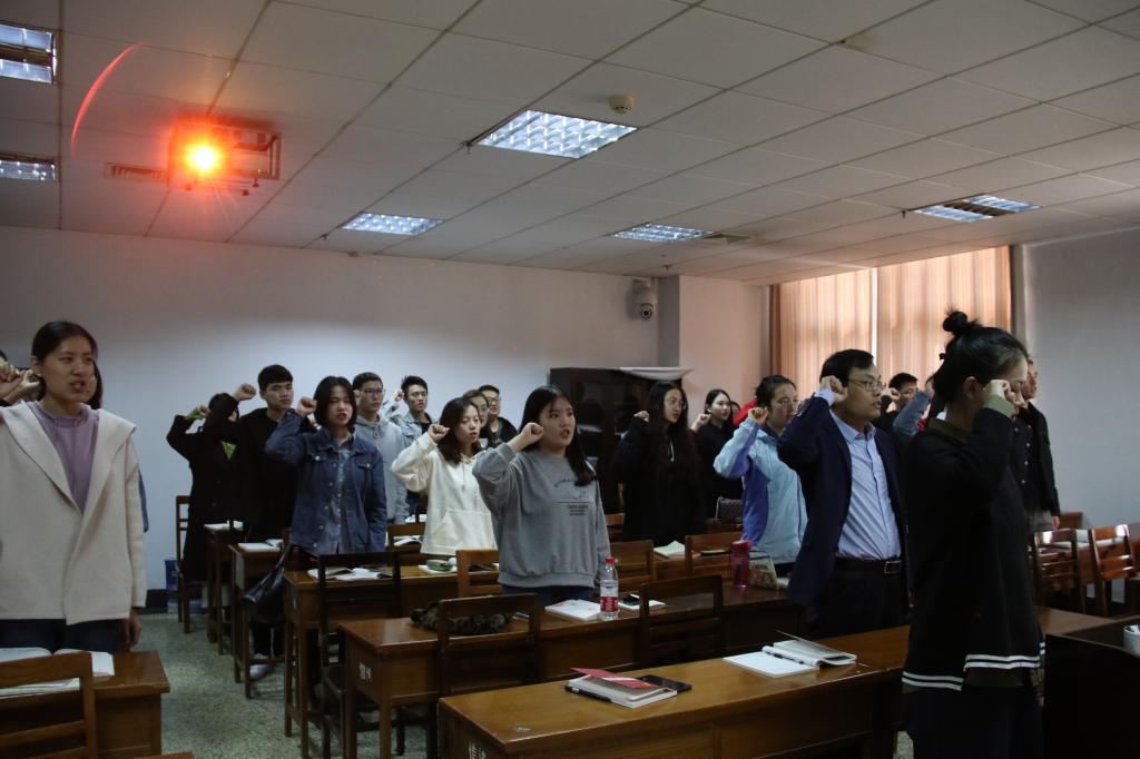最后,全体党员起立,重温入党誓词,庄严、坚定的声音在教室回响,相信广大党员同志会更加坚定自己入党时初心,成长为一名更优秀的中国共产党员。