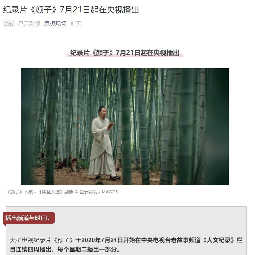 7月21日起,大型电视纪录片《颜子》将于每周二的11:30、19:30在中央电视台老故事频道《人文纪录》栏目连续四周播出。此节目由知名儒学专家、老虎机