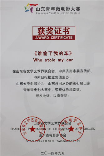 比赛面向社会公开征集,吸引了国内各大高校、影视文化公司、微电影爱好者参加,共收到参赛作品500余件。由山东省委宣传部、山东省文联、山东省电影家协会组织省内外电影导演、表演、评论、技术等专家、院线负责人、发行业负责人等组成评审委员会评审,共评出获奖作品51部共32个奖项。我院2011级数字媒体艺术专业作品《谁偷了我的车》荣获大赛故事片类三等奖以及优秀编剧奖,由赵鑫指导的作品《空巢》获公益片三等奖。