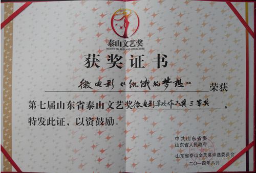 据悉,“泰山文艺奖”的评审对影片有较高要求,参选影片需要有过规模展播,获过一定程度的奖励。《饥饿的梦想》在此前入围了科讯杯国际大学生电影大赛,获得了山东省科技文化艺术节微电影大赛故事片一等奖,还拿过学校的先进文化项目。剧组把以前的获奖证书复印下来交给老师,填写了申报表,由老师协助提交了申请。最终,第七届山东省“泰山文艺奖”公布获奖名单,《饥饿的梦想》获得微电影类单项作品三等奖。