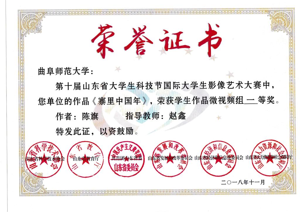 广播电视专业硕士研究生陈旗在导师赵鑫老师指导下创作的纪录片《寨里中国年》,喜获微视频类一等奖。同时,孔勇老师指导的本科生作品获二等奖一个、三等奖六个、优秀奖三个。据悉,本次大赛面向山东省近百所高校征集影像艺术作品,经大众和专家等多轮评选,最终微视频类评选出8部一等奖作品。