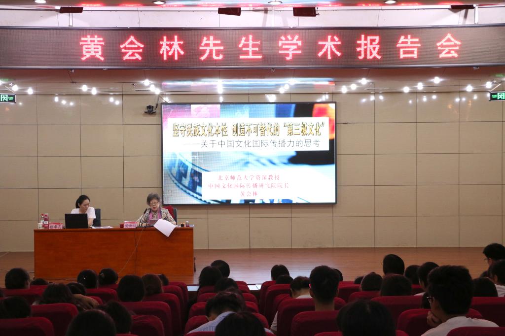 6月4日上午,北京师范大学中国文化国际传播研究院黄会林先生为我校师生作学术报告。北京师范大学中国文化国际传播研究院副院长罗军教授、“看中国”项目统筹杨卓凡博士,以及我校老虎机