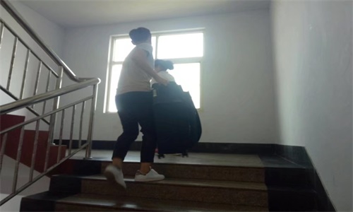 图七、图八:我院学生会特意安排了宿舍引领同学,在新生到达宿舍后帮忙搬运行李及被褥,工作人员不辞辛苦,为新生及家长带来了优质的体验。