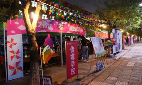用彩色风车装饰迎新报到处,蕴含梦想与追梦的风车迎风旋转,形成了一道靓丽的风景线。风车高高挂起,为新生和家长引路,带给大家一丝清凉。