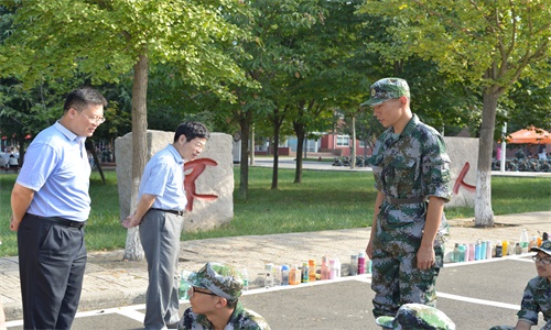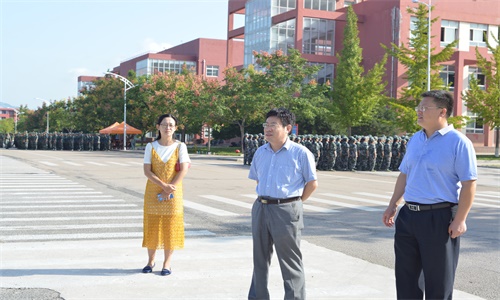 院党委书记李兴保、党委副书记徐正伟、团委书记刘蓉来到新生军训场地,慰问新生。各连队军姿挺拔的学生高声喊出“老师好!”来欢迎他们的到来。