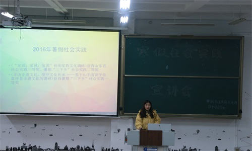 会议伊始,郑群向同学们简单介绍了假期社会实践的一些相关要求。随后,她和大家分享了她的社会实践调研计划并从前期准备、中期进行、后期调整三个方面向大家介绍了社会实践活动的流程。她表示,在前期准备时要确定好采访的对象及地点,并安排好人员及分工;在中期进行时,要走访相关人员了解情况,做好记录,并着重强调了安全问题;在后期整理中,要进行资料的整理与汇总工作。郑群用清晰的语言,向同学们讲述了社会实践的流程,让同学们对社会实践的过程有了更加清楚的认识。最后,她向同学们展示了2016年、2017年暑假社会实践获奖队伍名单,并鼓励同学们积极参与。