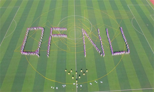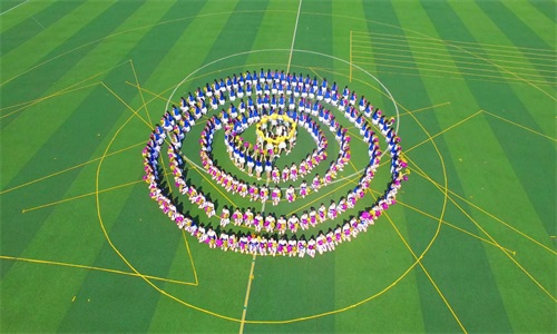 团体操队以“贪吃蛇”的形态进场,创意十足,让人眼前一亮。活力四射的舞步洋溢着青春的气息,富有内涵的队形伴随音乐节奏不断变化,从最初的两个三角形变成六芒星形。六芒星寓意着曲园学子不孜不倦、勤勉躬行的宝贵品质,彰显出曲园海韵、杏坛儒风的独特魅力。接着,队形变成了12条直线并开始跑圈,年轻的学子层层叠叠,最终围成了三层圆圈,组成太阳的形象,寓意“渊源共生,和谐共融”。随后团体操队排成的“Q、F、S、F”四个字母与“1955、2018”两组数字,代表“老虎机