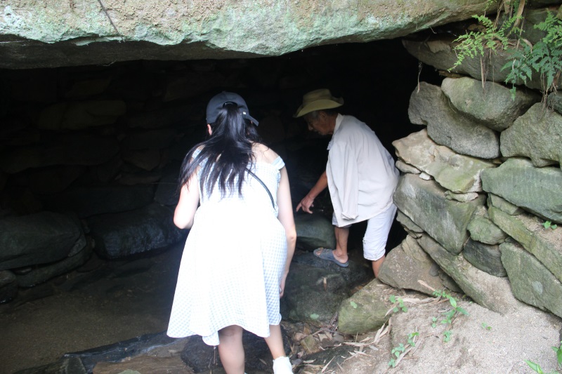 下午,调研小队来到了位于爱国村的回龙观文化遗址,去探寻回龙观背后的文化内涵。据了解,回龙观原名回龙庵,海拔636.7米,始建于明初太祖年间的1370年,距今已近700年历史。明末清初,回龙观声名远扬,所辖范围北至诸城,南辖江苏、赣榆,西至莒县,是鲁东南的道教中心。随后调研队在当地一位村民的带领下,经过了一段崎岖不平的小路,终于找到了回龙观。首先看到的是一个残破的拱形石门,尽管石门不再完整,但是残留的部分依然保留完好。在石门的一侧,有一条小溪缓缓流淌,当地村民说这是山上流下来的泉水,在流水中有几块大石头,传说这几块石头上有道士孙玄清用千年龟尿研墨写下“明月清风调,高山流水音。子期今不遇,谁识伯乐心。”的诗句。关于回龙观的这些传说也给这个古老的遗址增添了一抹神秘的文化色彩。