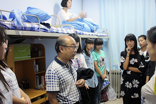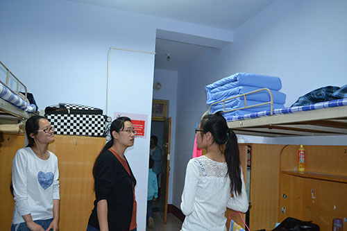 在学生宿舍,肖龙航、刘蓉与同学们进行了亲切的交谈,详细询问了学生的家庭情况、入学报到情况以及对学校环境的适应情况,认真耐心地解答了学生提出的各种问题。肖龙航鼓励同学之间一定要相互关心、互相帮助、共同进步,切忌拉帮结派,尤其是外省的同学更要尽快地适应新环境,调整好心态,为即将开始的大学生活做好准备。刘蓉告诉同学们,遇到困难一定要及时向学院领导反应,学院一定会全力解决同学们的困难,保证同学们有一个良好的学习和住宿环境。肖龙航着重强调一定要树立安全意识,把安全问题放在首位,保护好自己的人身和财物安全,杜绝加入传销组织,以防上当受骗并仔细检查了学生的用电安全,提醒学生宿舍物品损坏一定要及时报修。刘蓉叮嘱同学们要勤于学习、善于思考,并希望同学们能学到真本事,将来为社会做出更大贡献。