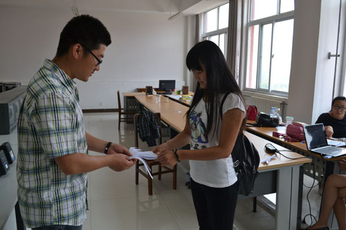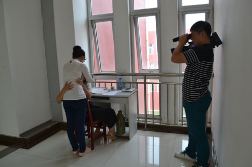 五组同学将从上午八点开始,分别依次参加比赛。每组都有半小时现场自由创作时间,共计拍摄五个镜头,拍摄范围不超过日月广场和S楼。经过赛前抽签选题,每位参赛选手都抽到了要求拍摄的题目。这些题目都是几个较小的生活片段,但如何用五个镜头展现出不一样的内容,这成为了每个选手最需要思考的问题。抽签完毕的选手们各自拿着摄像机分散开来,到处寻找取景的地点。半个小时的创作时间让每位选手都感觉时间紧迫,他们一边构思情节,一边研究取景,同时与演员讲解片段内容,体验了一把实战当导演的感觉。情节简单,那就通过巧妙的拍摄手法来丰富充实;场景单一,就试着多换几个角度拍摄。经过一番思索和尝试,每位选手都按照自己对题目的了解拍摄好了作品。