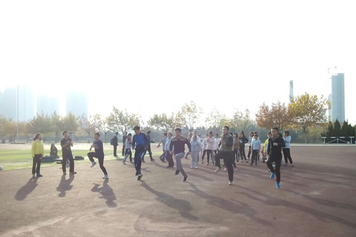 训练伊始,在体育部师哥师姐的带领下,运动员们开始了一系列的准备活动。先是15分钟的压腿热身,瑟骨的寒风穿透衣服,掠走残留在身上的最后一丝温暖,尽管如此,大家还是卯足精神,保持动作的标准。接下来是蹬腿跑,由于这个比较难掌握角度与力度,所以高鹏飞亲自给大家示范了蹬腿跑的基本动作要领,运动员们练习了20分钟左右后效果显著。最后交叉步跑10分钟。