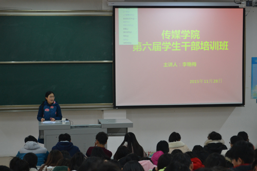 第六届学生干部培训班第五讲在JA102举行。本次培训由校区管理办公室老师李艳梅担任主讲人,第20届团总支学生会全体干事参加本次培训。