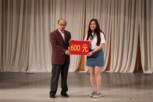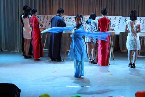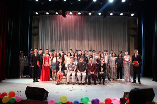 晚会接近尾声时,礼仪小姐把蛋糕推上舞台,来自墨缘书法协会的李林宇在蛋糕上书写了“墨缘”两字,并由四位老师亲自切下蛋糕。肖龙航代表学院向墨缘书法协会注入600元社团活动资金作为学院对优秀社团的奖励。在悠扬动听的大合唱《因你而在》中,晚会落下帷幕。