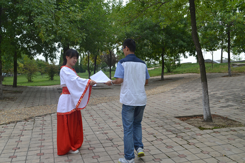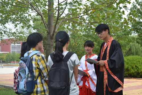 本次“孔子宣讲”活动共分为两个部分:一是春秋战国时期的服饰文化宣传。一男一女两个学生,身着春秋战国的衣服向同学们宣传孔子文化,春秋服饰华丽美艳,显示了春秋人民的聪慧与勤劳。二是孔子文化、论语的宣传。“益点文化”队在校园内随机挑选同学,向他们讲述论语等与孔子有关的知识,并特地开展了一次小型的“孔子文化”讲程,邀请同学们前来听讲。