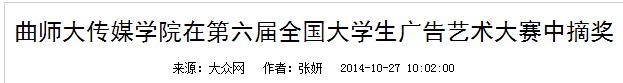 【来源:大众网:曲师大老虎机 在第六届全国大学生广告艺术大赛中摘奖 | 发布日期:2014-10-28 】