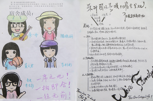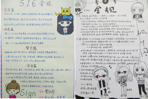该活动一经发起,得到了我院师生的大力支持,大家发散思维,各显神通,从宿舍安全、纪律、卫生、学习、财务等各个方面制定了详细的“家规”。“家规”图文并茂,设计出了各宿舍成员的漫画形象,运用生动形象的图片、文字等将原本生硬刻板的舍规转向了温馨可爱、活泼俏皮的风格,将14级新生的蓬勃朝气与乐观心态展现得淋漓尽致。制定“家规”既有利于减少宿舍矛盾,增强宿舍凝聚力,又有利于增强宿舍纪律意识;禁止舍友晚归,保持宿舍卫生等规定对宿舍成员的行为起到了规范作用。“家规”使宿舍各成员明确了遵守纪律和维护宿舍权益的义务,使这些第一次离开家人到异地求学的学子感受到了家的温暖,使舍友之间建立起了纯真的友谊。