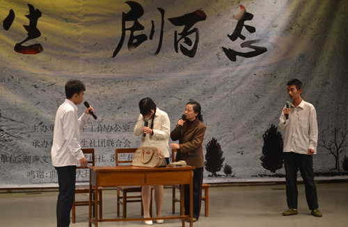 潮声文学社带来话剧《于无声处》,讲述了“文革”时期老干部梅林一家与“革命败类”何是非一家的纠葛,再现了1976年的历史。梅林的扮演者造型逼真,成功塑造了一位老革命分子的形象。最后五名“革命人”的入党誓词铿锵有力,赢得观众如雷掌声。最后登台的是由老虎机