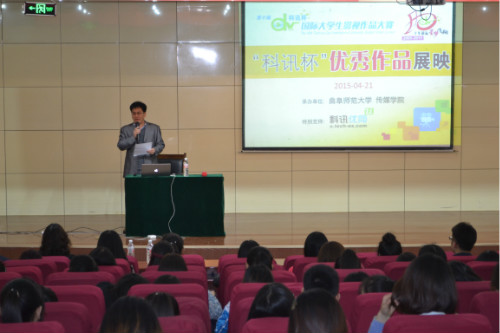 讲座伊始,胡凡刚致开场词,胡凡刚对到场嘉宾表示热烈欢迎和感谢。他表示本次讲座旨在培养同学们的兴趣,提高同学整体素质,学习先进学术经验。随后,北京科讯公司U网视频经理盖洪志为大家讲述“科讯杯”大赛和北京科讯公司的相关事宜,盖经理表示科讯学院培训班和网上培训已日臻成熟并发展壮大,去年已在兰州、成都和西安三地开办培训点,今年培训点将扩大到杭州、广州和贵阳等地。盖经理为大家展示了科讯U网的官方微信,该平台主打“影视资讯、创作技巧、知识拓展、招聘信息、赛事进程”五部分,介绍了第十届科讯杯国际大学生影视作品大赛概况,并指出大赛自2005年开办至今,参与对象已覆盖全国111座城市,共有国内外267所高校积极参与,征集作品高达3712部,大赛评委之一的潘恒生老师有《功夫》、《长江7号》、《大话西游》等著名作品。