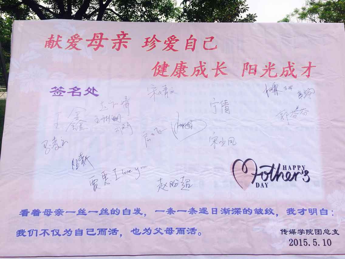 本次活动于当天上午11:00圆满结束。本次“献爱母亲——母亲节签名活动”取得了极大反响,吸引了广大同学的热情参与,不仅唤起了同学们对母爱亲情的感恩之心,更为不在母亲身边的学子们提供了一个传达感情、倾诉内心的平台,为远在家乡的母亲送上了母亲节最真挚的祝福。献爱母亲,珍爱自己,相信环抱感恩之心的同学们会在曲师走向更加阳光与健康的未来!