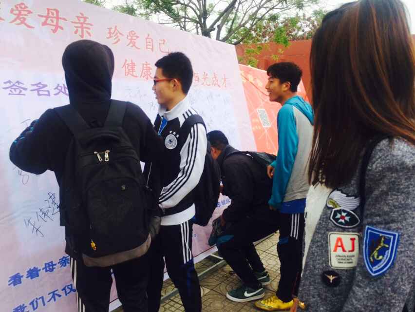活动伊始,女生部在学校北门展板处贴上横幅,并向大家宣传说明本次活动的主题为:献爱母亲,珍爱自己。并在横幅上打上了“献爱母亲,珍爱自己。健康成长,阳光成才”的标语,感召大家感恩母爱。活动过程中,女生部相关负责人员为大家耐心讲解了本次活动的目的及意义,同学们受到感召纷纷在展板上签上自己的名字以表明自己会牢记母爱恩情,感激母亲的付出。