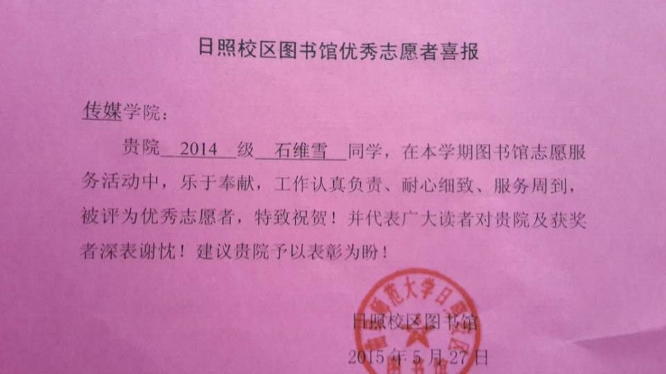 2015年5月27日,我校图书馆开展了图书馆优秀志愿者评比活动,我院3名同学得到认可并获得“优秀志愿者”荣誉称号。
