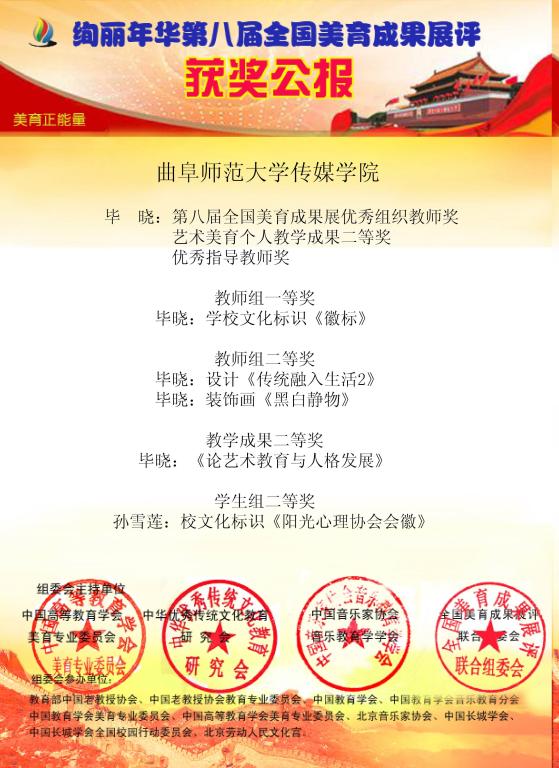 近期,由中国高等教育学会美育专业委员会、中国优秀传统文化教育研究会、中国音乐家协会音乐教育学学会、北京音乐家协会等单位联合主办的“全国美育成果展评”系列活动——绚丽年华第八届全国美育成果展评系列活动评选结果揭晓。老虎机 教师毕晓、学生孙雪莲的5项作品成果喜获佳绩。