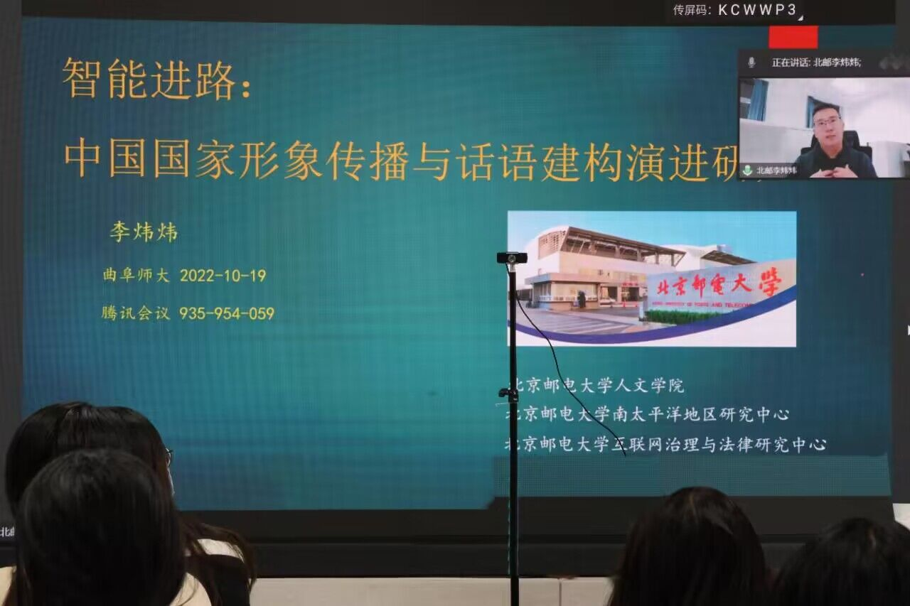 于JC813举办“智能进路:中国国家形象传播与话语构建演进”主题讲座活动。北京邮电大学教师李炜炜担任主讲,学院新闻系副主任孙浩主持活动, 部分新闻学学生线下参与学习,其他同学积极线上同步参与讲座学习。