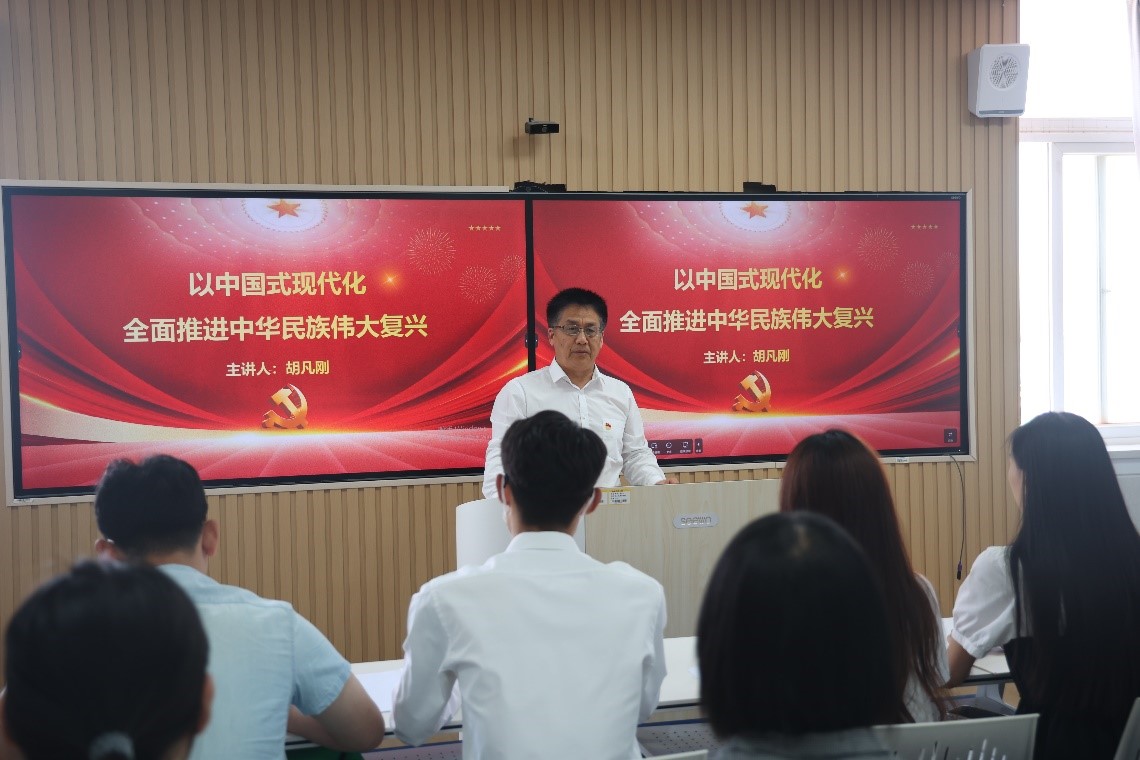 胡凡刚以“以中国式现代化全面推进中华民族伟大复兴”作为本次党课的主题,从中国式现代化的概念、中国式现代化的政治前提和制度基础、中国式现代化的理论依据和历史选择等五个方面为切入点,重点分析了中国式现代化在实现中华民族伟大复兴的重要作用。同时分析道,中国式现代化具有的鲜明的开放性、强大的感召力、鲜明的包容性等特质,使其在实现中华民族伟大复兴的历史使命中,有天然的优势。胡凡刚鼓励同学们,作为一名中共党员,应深入贯彻中国式现代化建设的本质要求,坚持中国共产党的领导,牢记习近平总书记嘱托,以奋发向上的斗志在新时代不懈奋斗、建功立业。
