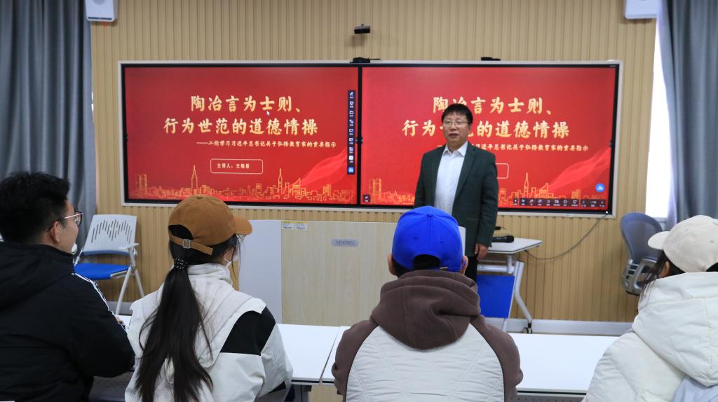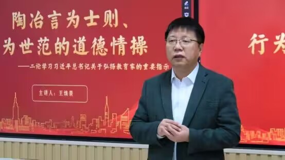 于JC813开展学习习近平总书记关于教育的重要论述系列党课第二讲,集体学习《陶冶言为士则、行为世范的道德情操——二论学习习近平总书记关于弘扬教育家精神的重要指示》。本次党课由学院院长王焕景担任主讲,学院部分师生党员参与学习。