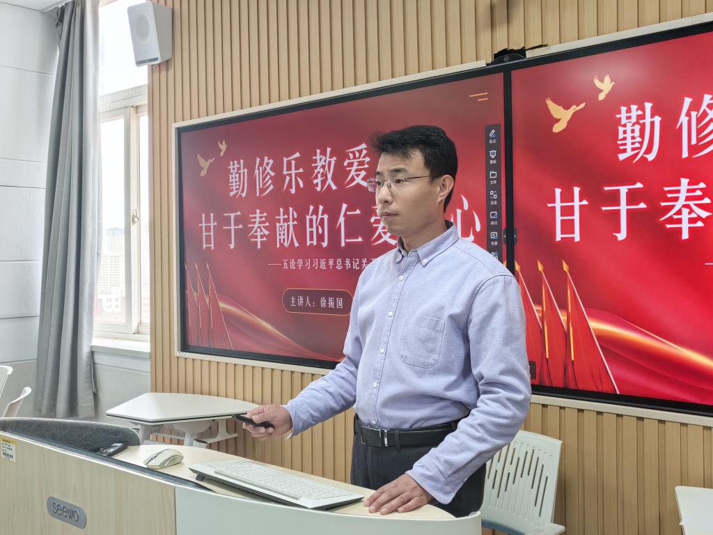 开展学习习近平总书记教育重要论述系列党课第四讲,集体学习《勤修乐教爱生、甘于奉献的仁爱之心——五论学习习近平总书记关于弘扬教育家精神的重要指示》。活动由教工党支部书记徐振国担任主讲,部分研究生党员参与活动。