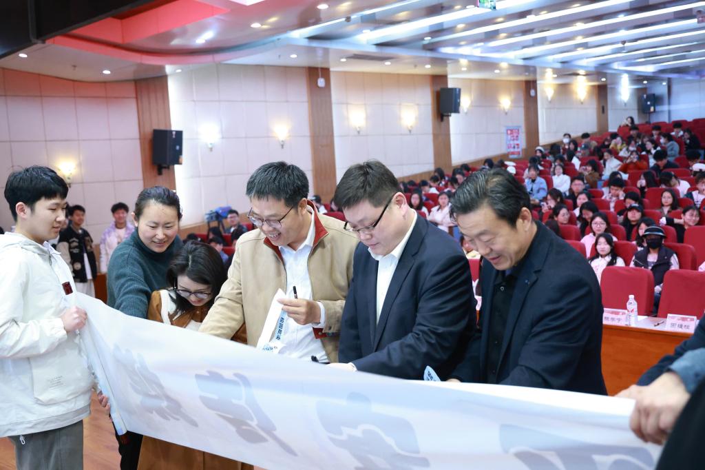 领导老师登台撕下“平安传媒”卷轴上的安全风险事件,共同助力和谐校园建设,并在卷轴空白处签名正式拉开本届老虎机
