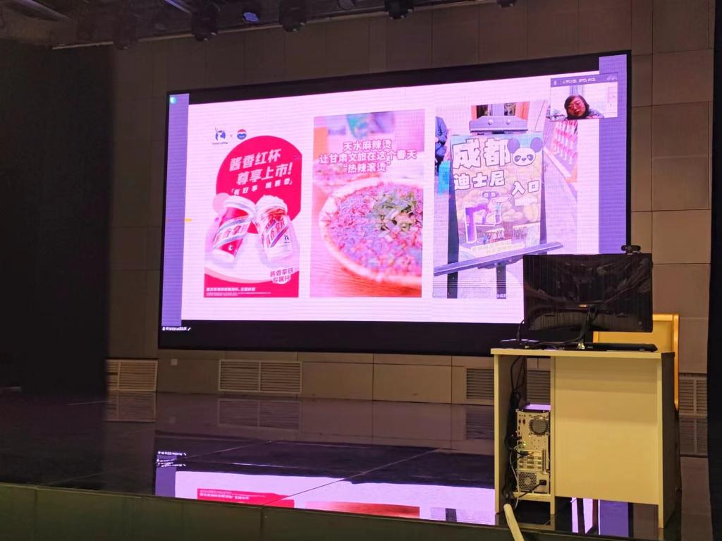 赵贺主要从广告案例展示、传播理论分析和创意构思实践三个方面展开讲解。她首先以《枪击玛丽莲(鼠尾草蓝色)》这一著名广告案例为切入点,对“后工业时代广告创意的变革”展开解读。她指出,随着后工业时代的到来,广告创意已不再是单一的信息传递,而是融合了技术、文化、艺术等多种元素的综合表现。创意广告正逐步成为传递文化价值和社会观念的重要载体。紧接着,赵贺从现实成功的广告案例入手,重点向同学们分析了“符号理论在广告传播中的运用”。符号是广告创意的重要组成部分,通过巧妙地运用符号,广告能够在瞬间触动受众情感,引发消费者共鸣,同时符号的选择和解读也反映出不同文化背景下的价值观和审美观念。赵贺指出在传播仪式观理论视角下,广告不仅是一种商业行为,更是一种文化现象。在传播过程中,广告创意往往承载着特定的文化内涵,通过构建特定的传播仪式,使受众在接收信息的同时,也感受到文化的熏陶和感染。