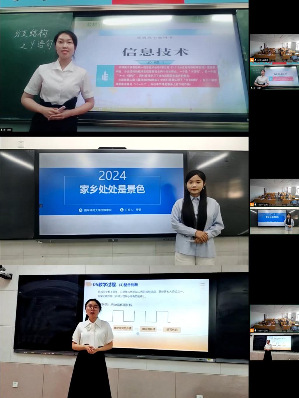 比赛分为三个小组,以说课形式借助腾讯会议进行。参赛选手依据教学设计,从中小学信息技术教材中自主选择一个“教学片段”或“环节”进行说课,并选取核心内容进行模拟上课和板书设计。
