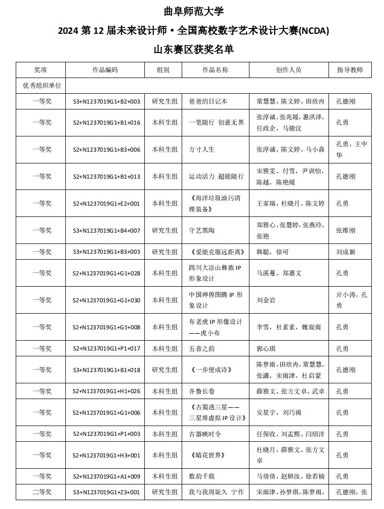 近日,第12届未来设计师·全国高校数字艺术设计大赛全国总评审结果和山东赛区评审结果揭晓。传媒学子在比赛中获全国奖项14件,其中一等奖3件,二等奖4件,三等奖6件,人气奖1件;在本届山东赛区中,获一等奖17件,二等奖13件,三等奖24件。